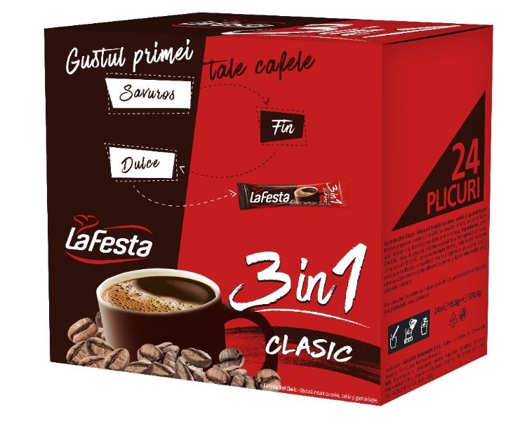 LA FESTA Cafea Instant 3 In 1 Clasic 24 x 15,6 g. Disponibil pe cafea.dpnet.ro.